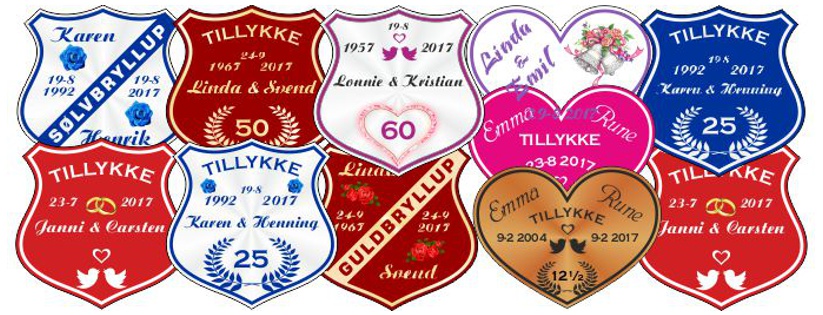 Bryllupsskjold, Bryllupsskilte og Bryllupshjerter til æresport, Bryllup, Kobberbryllup, Sølvbryllup, Guldbryllup, Diamantbryllup, Krondiamantbryllup, Jernbryllup